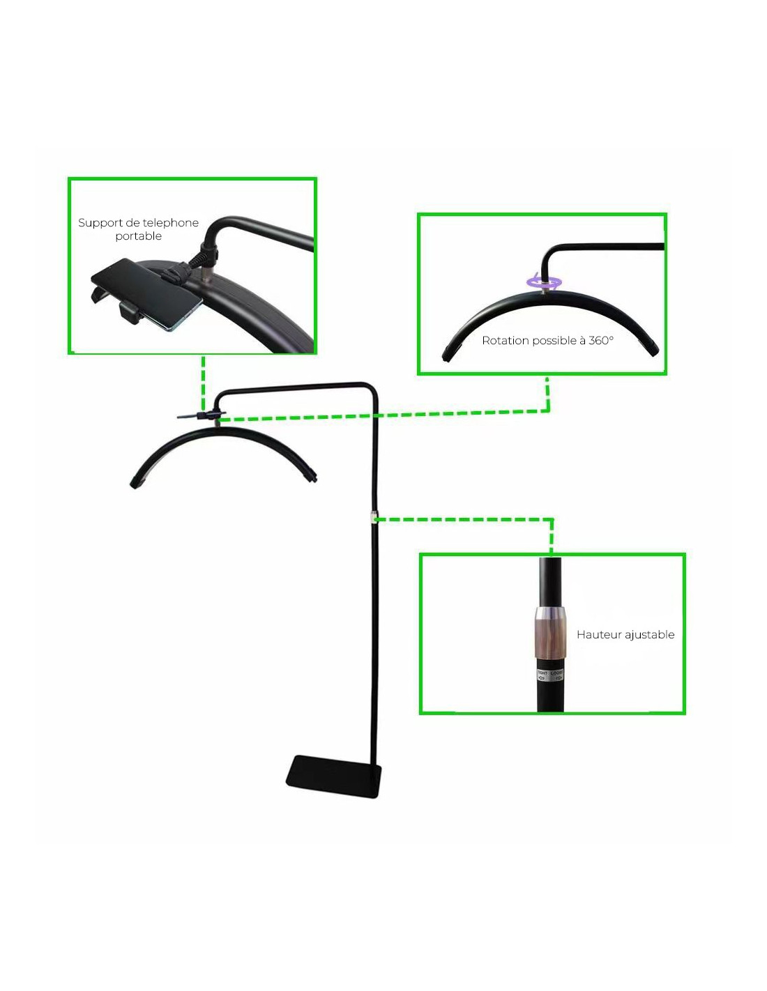 Son design incurvé réduit efficacement les ombres, tandis que sa hauteur réglable et sa rotation à 360° assurent une adaptabilité parfaite à toutes les situations.